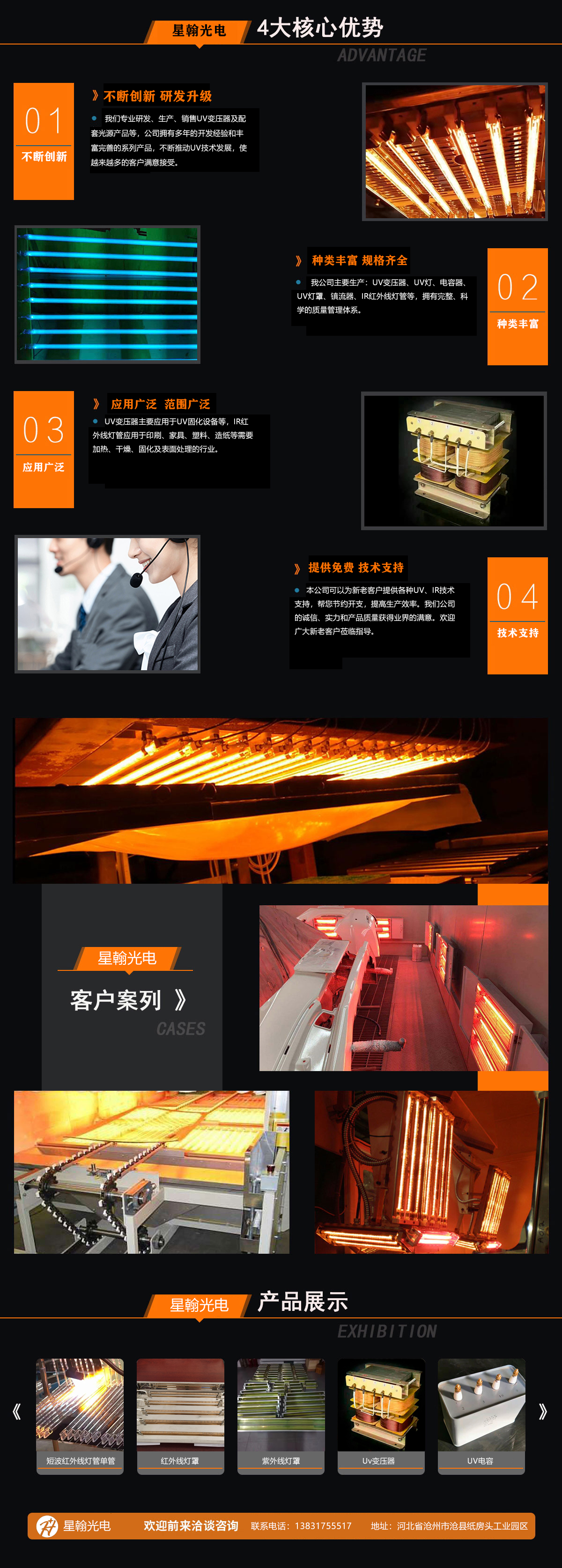 滄州星翰光電科技有限公司成立于 2002 年,我們專業(yè)研發(fā)、生產(chǎn)、銷售各類特種光源產(chǎn)品,配套電器等,公司擁有多年的開發(fā)經(jīng)驗和豐富完善的系列產(chǎn)品,不斷推動 UV、IR 技術(shù)發(fā)展,使越來越多的客戶認可接受,前沿的技術(shù)、嚴格的產(chǎn)品質(zhì)量管理和我們的專業(yè)知識、確保其與客戶的生產(chǎn)設(shè)備完全配套整合以專業(yè)熱誠、精準、速度迎向客戶!...